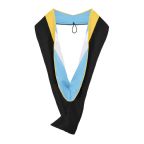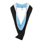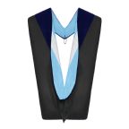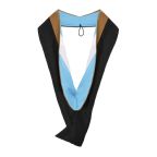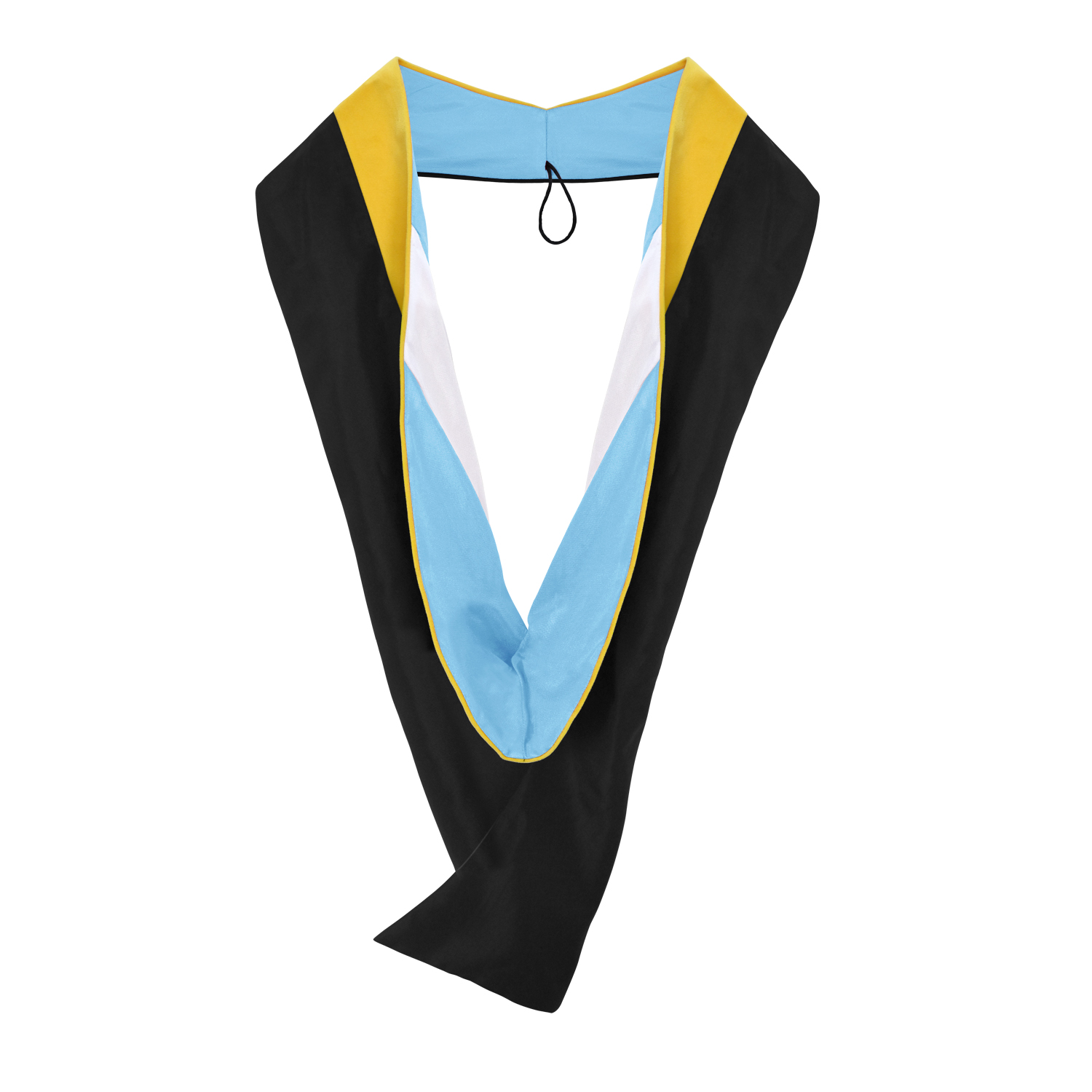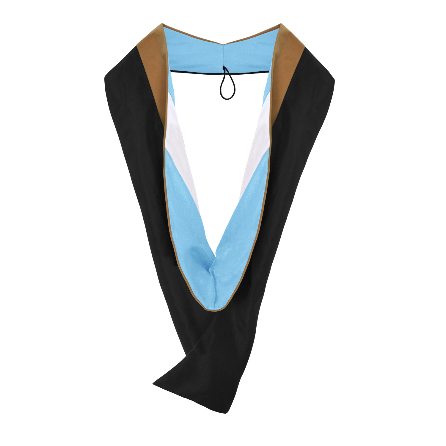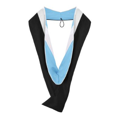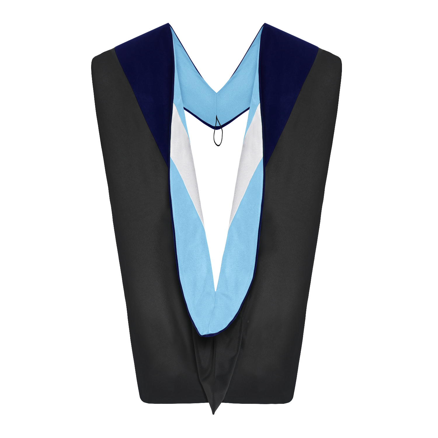 An academic hood is a colorful piece of academic regalia worn over the shoulders and down the back, which signifies the wearer's degree level, field of study, and the university that granted the degree. It is composed of a black outer shell, a satin lining with white chevron on field of Columbia Blue, and a velvet trim that indicates the specific academic discipline. The hood drapes over the shoulders and is secured at the front, with the colorful lining often displayed